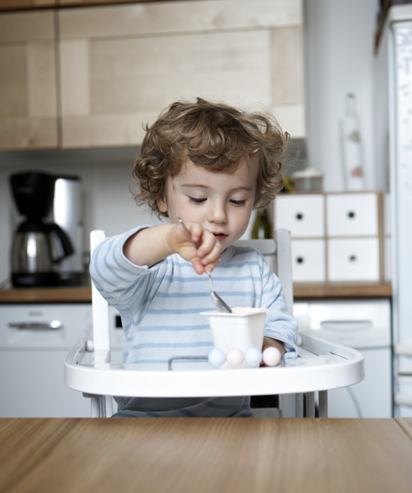 2. Begin with encouraging hand feeding.Before introducing feeding utensils to your baby, encourage her first to use her hands to move the food toward her mouth. A good way to start is to place a yogurt pouch or a few pieces of food on your baby’s highchair tray. Encourage her to reach for it, feel it, and play with it with her pincer grasp. It may look as if she isn’t doing much and not eating, but that’s actually how she starts to learn.