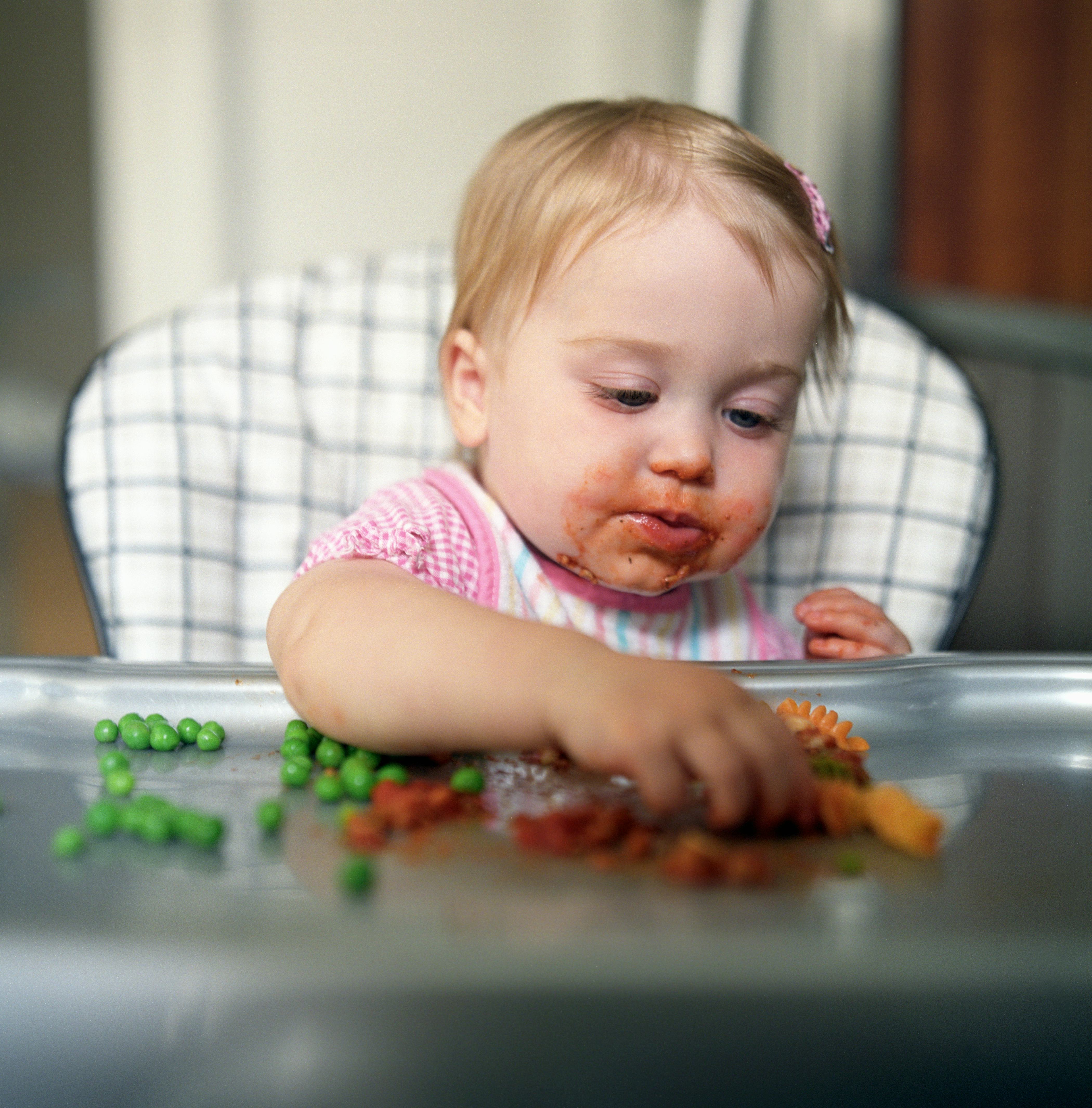 If your baby is eating and then starts to turn her head away or just refuses to open her mouth, she’s done! Babies may also start to fuss if they’ve had enough. Learning this new skill takes time and babies can become tired fairly quickly into the process, so don’t expect them to always eat very much or to last very long at the table. This stage is about exploration!